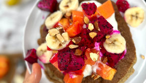 BANANA OAT PANCAKES with Greek Yoghurt, almonds & fresh fruit